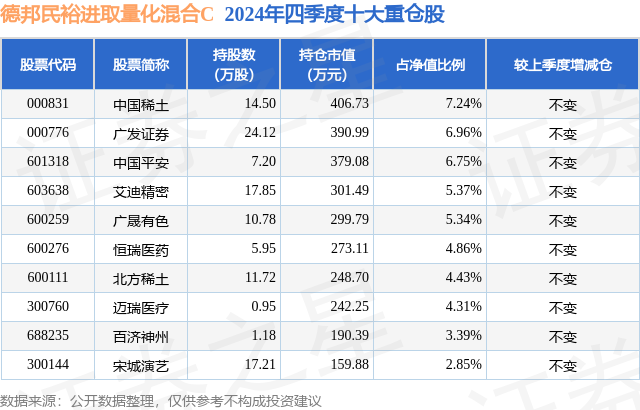 从基金规模来看,德邦民裕进取量化混合C基金2024年四季度公布的基金规模为0.07亿元,较上一期规模698.0万元变化了-43.52万元,环比变化了-6.24%。该基金最新一期资产配置为:股票占净值比66.13%,债券占净值比0.36%,现金占净值比33.82%。从基金持仓来看,该基金当季前十大股票仓位达51.5%,第一大重仓股为中国稀土(000831),持仓占比为7.24%。