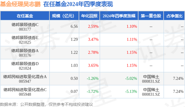证券之星消息,日前德邦民裕进取量化混合C基金公布四季报,2024年四季度最新规模0.07亿元,季度净值涨幅为-5.13%。
