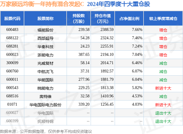 从基金规模来看,万家颐远均衡一年持有混合发起C基金2024年四季度公布的基金规模为1.61亿元,较上一期规模1.76亿元变化了-1484.75万元,环比变化了-8.44%。该基金最新一期资产配置为:股票占净值比93.88%,无债券类资产,现金占净值比7.09%。从基金持仓来看,该基金当季前十大股票仓位达62.35%,第一大重仓股为福能股份(600483),持仓占比为7.66%。