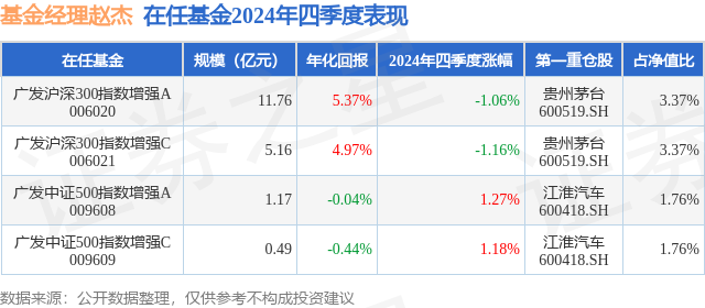 广发沪深300指数增强C现任基金经理为赵杰。其中在任基金经理赵杰已从业6年又209天,2018年6月29日正式接手管理广发沪深300指数增强C,任职期间累计回报为37.52%。目前还管理着4只基金产品(包括A类和C类),其中本季度表现最佳的基金为广发中证500指数增强A(009608),季度净值涨幅为1.27%。