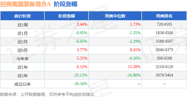 从业绩表现来看,招商高端装备混合A基金过去一年净值涨幅为6.12%,在同类基金中排名3210/4120,同类基金过去一年净值涨幅中位数为15.28%。而基金过去一年的最大回撤为-20.96%,成立以来的最大回撤为-52.83%。