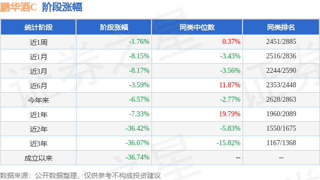 从业绩表现来看,鹏华酒C基金过去一年净值涨幅为-7.33%,在同类基金中排名1960/2089,同类基金过去一年净值涨幅中位数为19.79%。而基金过去一年的最大回撤为-32.4%,成立以来的最大回撤为-57.04%。