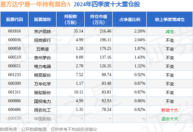 从基金规模来看,易方达宁易一年持有混合A基金2024年四季度公布的基金规模为0.85亿元,较上一期规模9896.44万元变化了-1445.82万元,环比变化了-14.61%。该基金最新一期资产配置为:股票占净值比19.66%,债券占净值比106.94%,现金占净值比2.09%。从基金持仓来看,该基金当季前十大股票仓位达13.26%,第一大重仓股为京沪高铁(601816),持仓占比为2.26%。