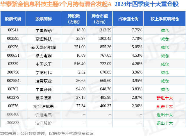证券之星消息,日前华泰紫金信息科技主题6个月持有混合发起A基金公布四季报,2024年四季度最新规模1.12亿元,季度净值涨幅为-0.76%。