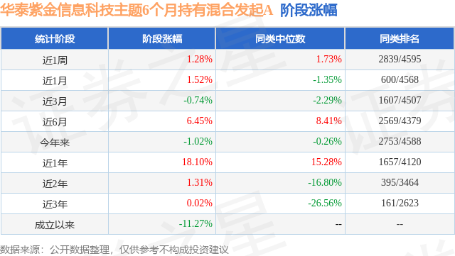 从业绩表现来看,华泰紫金信息科技主题6个月持有混合发起A基金过去一年净值涨幅为18.1%,在同类基金中排名1657/4120,同类基金过去一年净值涨幅中位数为15.28%。而基金过去一年的最大回撤为-9.26%,成立以来的最大回撤为-28.73%。