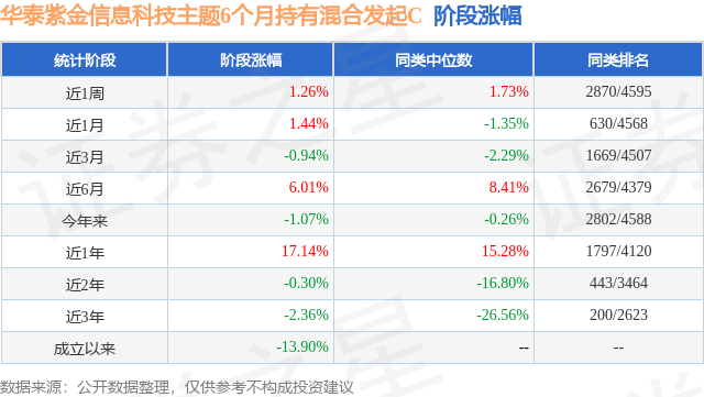 从业绩表现来看,华泰紫金信息科技主题6个月持有混合发起C基金过去一年净值涨幅为17.14%,在同类基金中排名1797/4120,同类基金过去一年净值涨幅中位数为15.28%。而基金过去一年的最大回撤为-9.37%,成立以来的最大回撤为-30.17%。