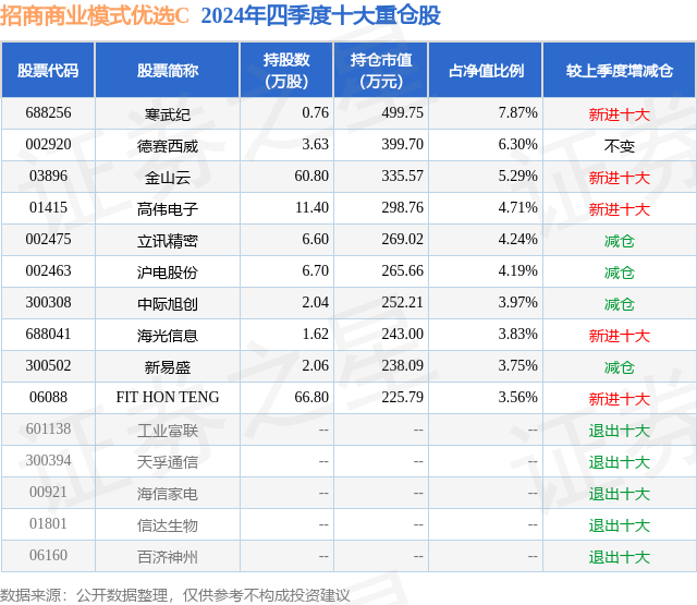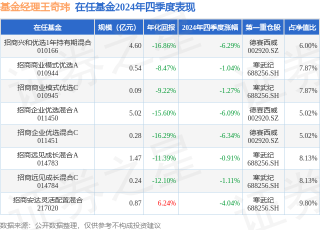 从基金规模来看,招商商业模式优选C基金2024年四季度公布的基金规模为0.09亿元,较上一期规模1075.97万元变化了-132.34万元,环比变化了-12.3%。该基金最新一期资产配置为:股票占净值比94.95%,债券占净值比5.99%,现金占净值比1.99%。从基金持仓来看,该基金当季前十大股票仓位达47.71%,第一大重仓股为寒武纪(688256),持仓占比为7.87%。