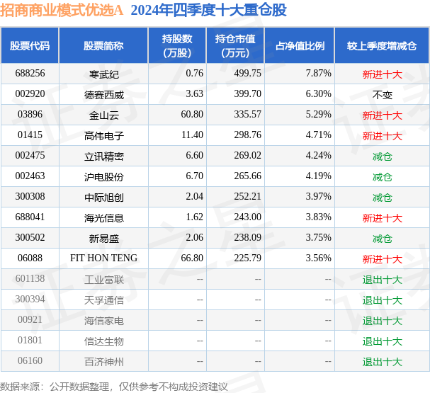 从基金规模来看,招商商业模式优选A基金2024年四季度公布的基金规模为0.54亿元,较上一期规模5466.19万元变化了-63.19万元,环比变化了-1.16%。该基金最新一期资产配置为:股票占净值比94.95%,债券占净值比5.99%,现金占净值比1.99%。从基金持仓来看,该基金当季前十大股票仓位达47.71%,第一大重仓股为寒武纪(688256),持仓占比为7.87%。