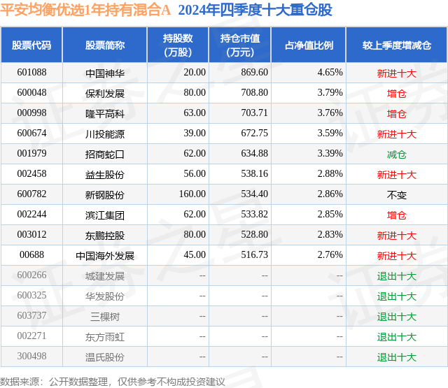 从基金规模来看,平安均衡优选1年持有混合A基金2024年四季度公布的基金规模为1.78亿元,较上一期规模1.92亿元变化了-1446.27万元,环比变化了-7.53%。该基金最新一期资产配置为:股票占净值比63.62%,无债券类资产,现金占净值比39.28%。从基金持仓来看,该基金当季前十大股票仓位达33.36%,第一大重仓股为中国神华(601088),持仓占比为4.65%。