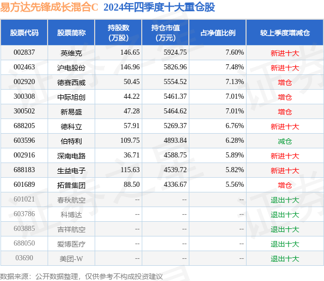 从基金规模来看,易方达先锋成长混合C基金2024年四季度公布的基金规模为2.59亿元,较上一期规模1.82亿元变化了7716.98万元,环比变化了42.46%。该基金最新一期资产配置为:股票占净值比94.07%,无债券类资产,现金占净值比6.83%。从基金持仓来看,该基金当季前十大股票仓位达66.54%,第一大重仓股为英维克(002837),持仓占比为7.6%。
