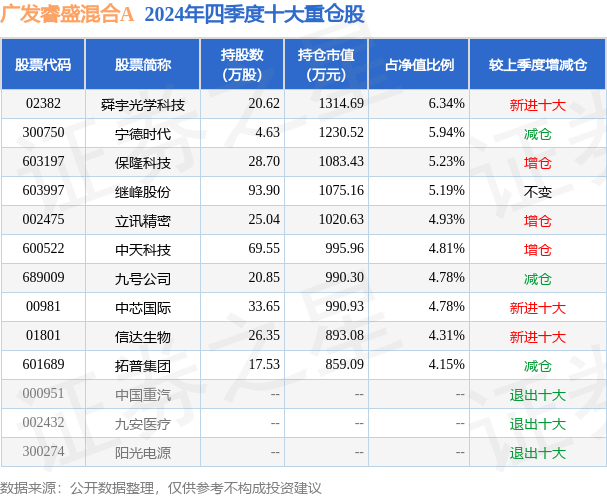 从基金规模来看,广发睿盛混合A基金2024年四季度公布的基金规模为1.9亿元,较上一期规模2.01亿元变化了-1128.3万元,环比变化了-5.61%。该基金最新一期资产配置为:股票占净值比81.03%,无债券类资产,现金占净值比10.16%。从基金持仓来看,该基金当季前十大股票仓位达50.46%,第一大重仓股为舜宇光学科技(02382),持仓占比为6.34%。