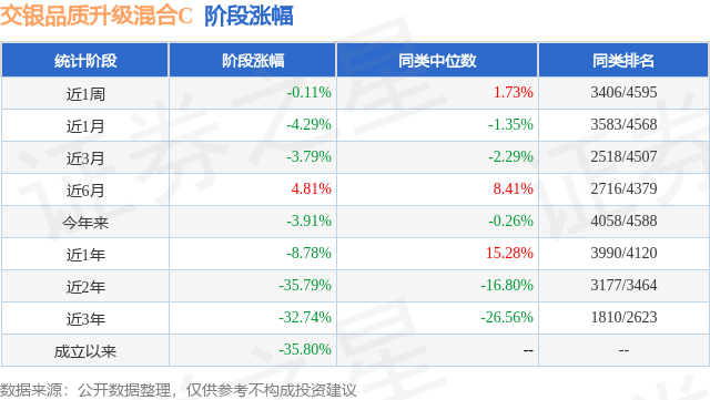 从业绩表现来看,交银品质升级混合C基金过去一年净值涨幅为-8.78%,在同类基金中排名3990/4120,同类基金过去一年净值涨幅中位数为15.28%。而基金过去一年的最大回撤为-31.27%,成立以来的最大回撤为-50.17%。