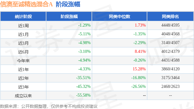 从业绩表现来看,信澳至诚精选混合A基金过去一年净值涨幅为-4.33%,在同类基金中排名3860/4120,同类基金过去一年净值涨幅中位数为15.28%。而基金过去一年的最大回撤为-22.72%,成立以来的最大回撤为-62.32%。