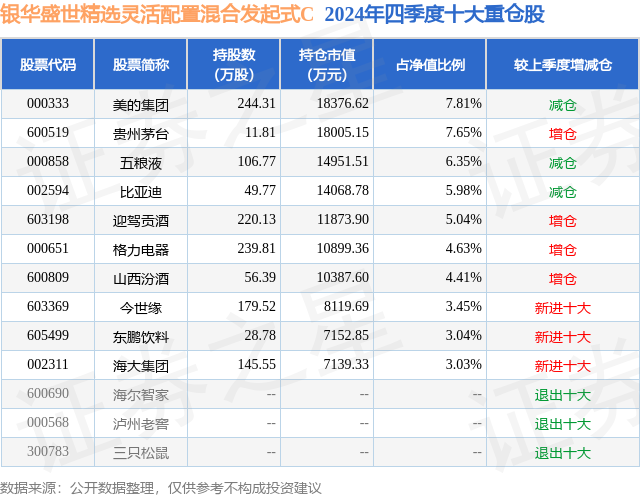 证券之星消息,日前银华盛世精选灵活配置混合发起式C基金公布四季报,2024年四季度最新规模0.04亿元,季度净值涨幅为-6.83%。