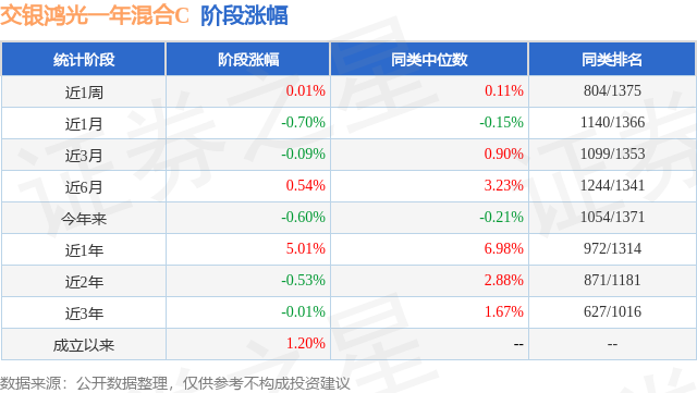 从业绩表现来看,交银鸿光一年混合C基金过去一年净值涨幅为5.01%,在同类基金中排名972/1314,同类基金过去一年净值涨幅中位数为6.98%。而基金过去一年的最大回撤为-1.8%,成立以来的最大回撤为-6.34%。