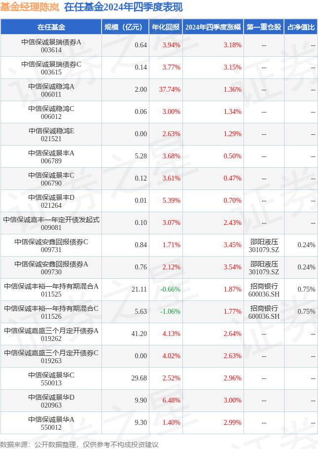 从基金规模来看,中信保诚丰裕一年持有期混合A基金2024年四季度公布的基金规模为21.11亿元,较上一期规模24.88亿元变化了-3.76亿元,环比变化了-15.13%。该基金最新一期资产配置为:股票占净值比8.72%,债券占净值比119.28%,现金占净值比0.41%。从基金持仓来看,该基金当季前十大股票仓位达5.05%,第一大重仓股为招商银行(600036),持仓占比为0.75%。