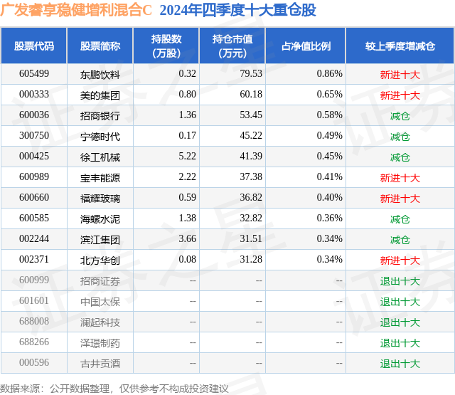 从基金规模来看,广发睿享稳健增利混合C基金2024年四季度公布的基金规模为0.0亿元,较上一期规模16.42万元变化了-2.14万元,环比变化了-13.06%。该基金最新一期资产配置为:股票占净值比8.04%,债券占净值比98.0%,现金占净值比0.8%。从基金持仓来看,该基金当季前十大股票仓位达4.88%,第一大重仓股为东鹏饮料(605499),持仓占比为0.86%。