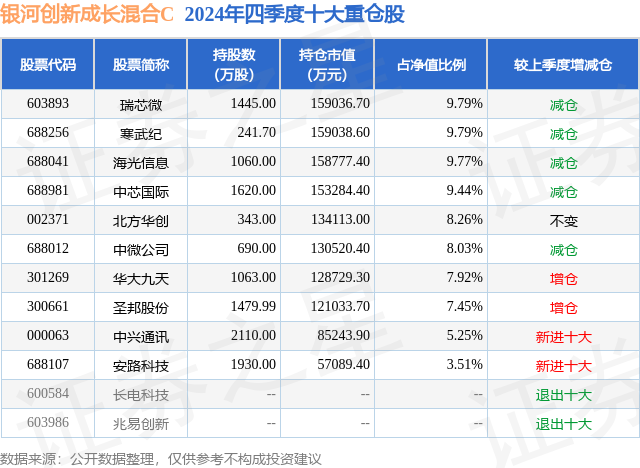 从基金规模来看,银河创新成长混合C基金2024年四季度公布的基金规模为20.38亿元,较上一期规模18.79亿元变化了1.59亿元,环比变化了8.44%。该基金最新一期资产配置为:股票占净值比93.88%,无债券类资产,现金占净值比7.75%。从基金持仓来看,该基金当季前十大股票仓位达79.21%,第一大重仓股为瑞芯微(603893),持仓占比为9.79%。