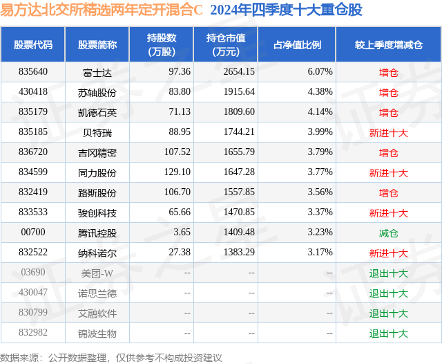 证券之星消息,日前易方达北交所精选两年定开混合C基金公布四季报,2024年四季度最新规模0.92亿元,季度净值涨幅为37.35%。