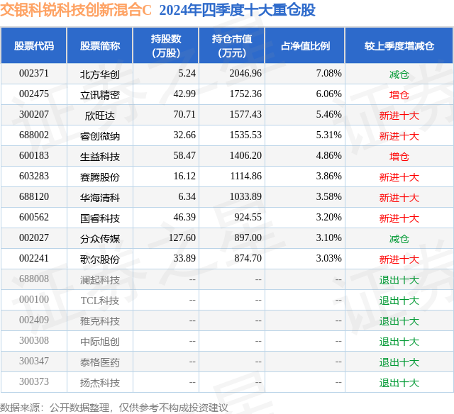 证券之星消息,日前交银科锐科技创新混合C基金公布四季报,2024年四季度最新规模0.19亿元,季度净值涨幅为-2.45%。