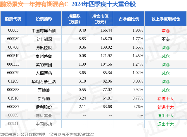 从基金规模来看,鹏扬景安一年持有期混合C基金2024年四季度公布的基金规模为0.05亿元,较上一期规模534.41万元变化了-54.15万元,环比变化了-10.13%。该基金最新一期资产配置为:股票占净值比21.09%,债券占净值比69.8%,现金占净值比9.17%。从基金持仓来看,该基金当季前十大股票仓位达12.55%,第一大重仓股为中国海洋石油(00883),持仓占比为1.98%。