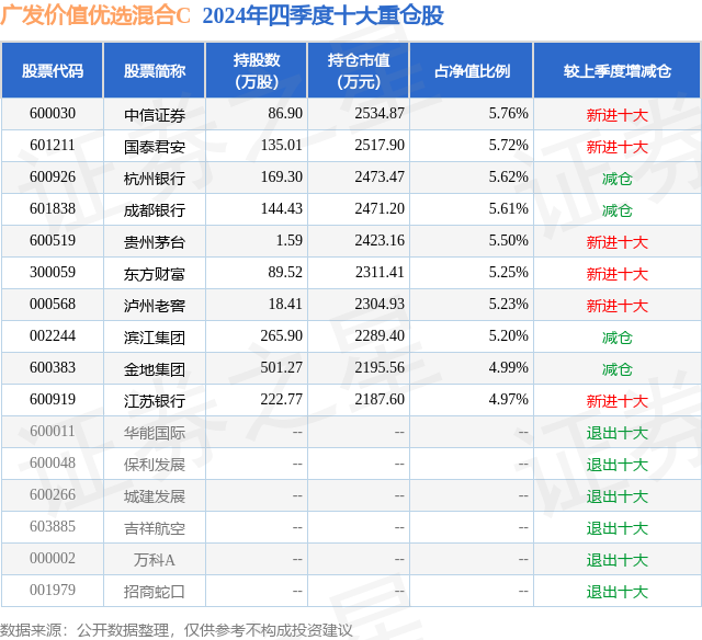 从基金规模来看,广发价值优选混合C基金2024年四季度公布的基金规模为1.12亿元,较上一期规模1.37亿元变化了-2528.06万元,环比变化了-18.44%。该基金最新一期资产配置为:股票占净值比94.53%,债券占净值比0.6%,现金占净值比5.54%。从基金持仓来看,该基金当季前十大股票仓位达53.85%,第一大重仓股为中信证券(600030),持仓占比为5.76%。