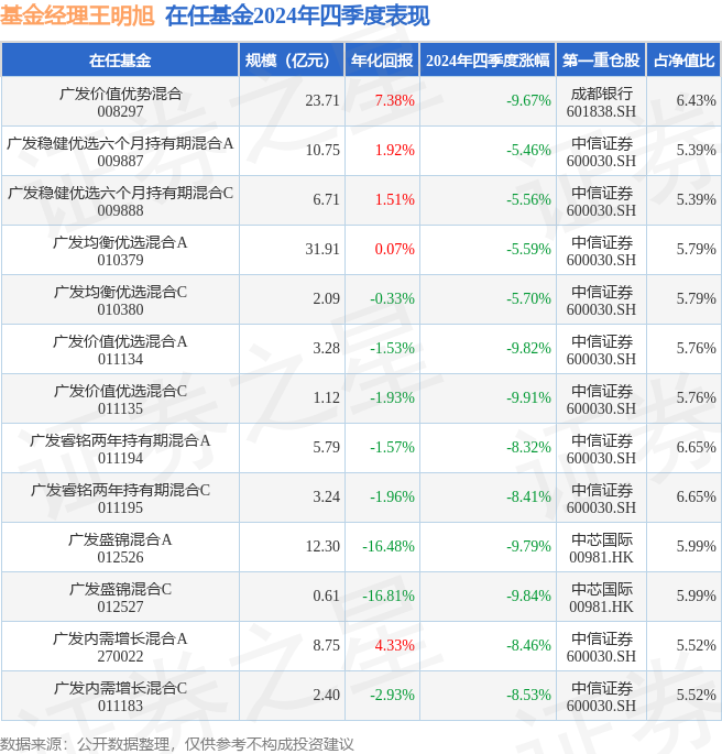 证券之星消息,日前广发价值优选混合A基金公布四季报,2024年四季度最新规模3.28亿元,季度净值涨幅为-9.82%。