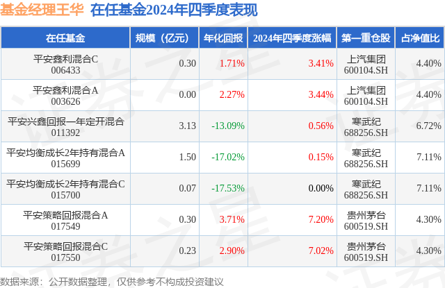 平安兴鑫回报一年定开混合现任基金经理为王华。其中在任基金经理王华已从业2年又242天,2023年11月13日正式接手管理平安兴鑫回报一年定开混合,任职期间累计回报为-6.53%。目前还管理着7只基金产品(包括A类和C类),其中本季度表现最佳的基金为平安策略回报混合A(017549),季度净值涨幅为7.2%。