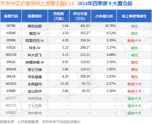 证券之星消息,日前平安中证沪港深线上消费主题ETF基金公布四季报,2024年四季度最新规模0.37亿元,季度净值涨幅为-1.78%。