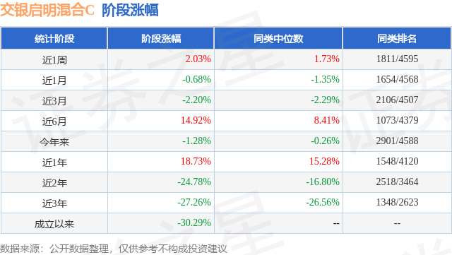 从业绩表现来看,交银启明混合C基金过去一年净值涨幅为18.73%,在同类基金中排名1548/4120,同类基金过去一年净值涨幅中位数为15.28%。而基金过去一年的最大回撤为-19.8%,成立以来的最大回撤为-46.59%。