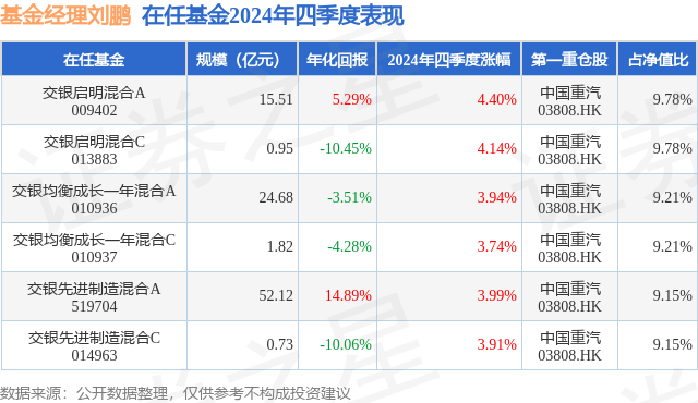 证券之星消息,日前交银启明混合C基金公布四季报,2024年四季度最新规模0.95亿元,季度净值涨幅为4.14%。