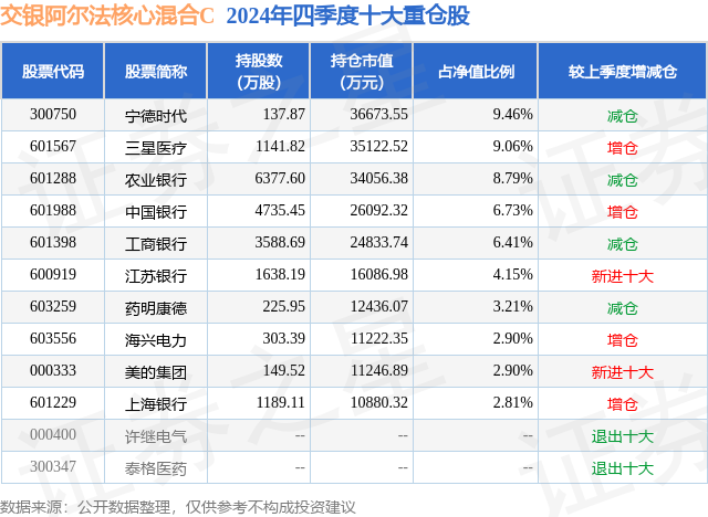 从基金规模来看,交银阿尔法核心混合C基金2024年四季度公布的基金规模为0.96亿元,较上一期规模1.23亿元变化了-2674.52万元,环比变化了-21.71%。该基金最新一期资产配置为:股票占净值比77.51%,债券占净值比5.22%,现金占净值比20.29%。从基金持仓来看,该基金当季前十大股票仓位达56.42%,第一大重仓股为宁德时代(300750),持仓占比为9.46%。