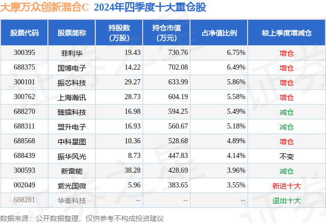 证券之星消息,日前大摩万众创新混合C基金公布四季报,2024年四季度最新规模0.7亿元,季度净值涨幅为6.33%。