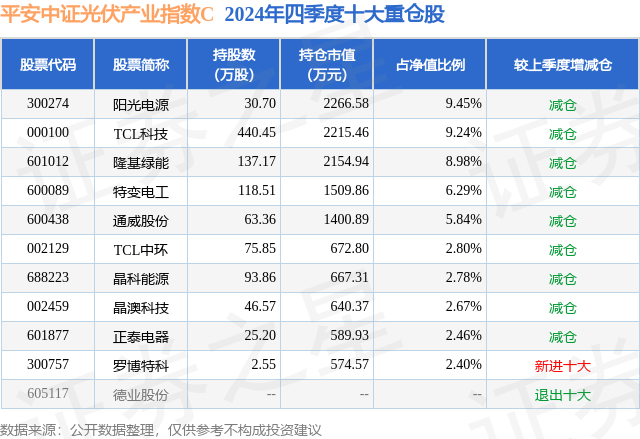 证券之星消息,日前平安中证光伏产业指数C基金公布四季报,2024年四季度最新规模1.85亿元,季度净值涨幅为-7.58%。