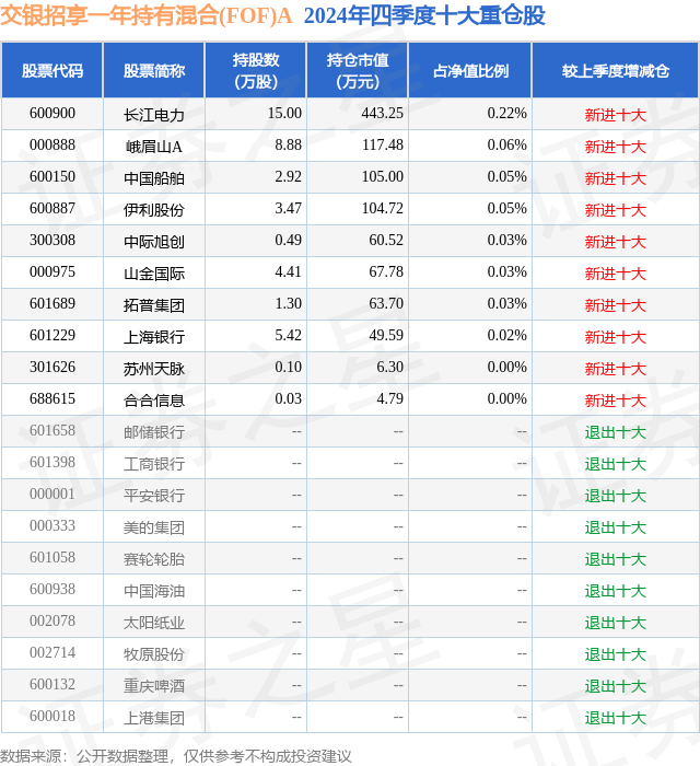 从基金规模来看,交银招享一年持有混合(FOF)A基金2024年四季度公布的基金规模为13.86亿元,较上一期规模17.41亿元变化了-3.56亿元,环比变化了-20.42%。该基金最新一期资产配置为:股票占净值比0.52%,债券占净值比5.64%,现金占净值比1.66%。从基金持仓来看,该基金当季前十大股票仓位达0.49%,第一大重仓股为长江电力(600900),持仓占比为0.22%。