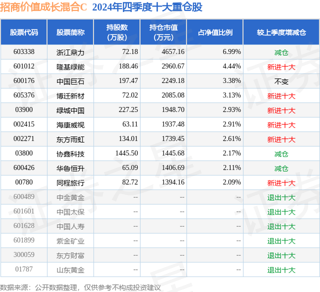 从基金规模来看,招商价值成长混合C基金2024年四季度公布的基金规模为1.52亿元,较上一期规模1.96亿元变化了-4438.85万元,环比变化了-22.64%。该基金最新一期资产配置为:股票占净值比82.48%,债券占净值比2.51%,现金占净值比11.11%。从基金持仓来看,该基金当季前十大股票仓位达32.76%,第一大重仓股为浙江鼎力(603338),持仓占比为6.99%。