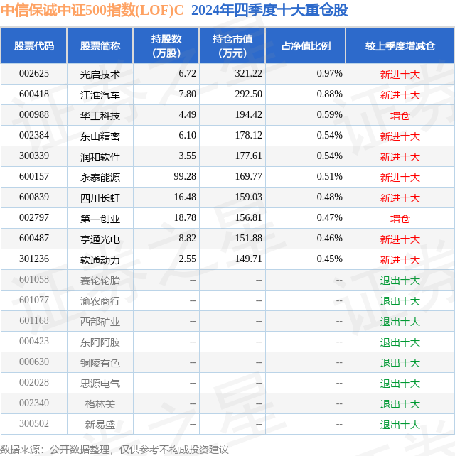 从基金规模来看,中信保诚中证500指数(LOF)C基金2024年四季度公布的基金规模为0.16亿元,较上一期规模1261.76万元变化了344.75万元,环比变化了27.32%。该基金最新一期资产配置为:股票占净值比94.26%,债券占净值比1.52%,现金占净值比4.54%。从基金持仓来看,该基金当季前十大股票仓位达5.89%,第一大重仓股为光启技术(002625),持仓占比为0.97%。