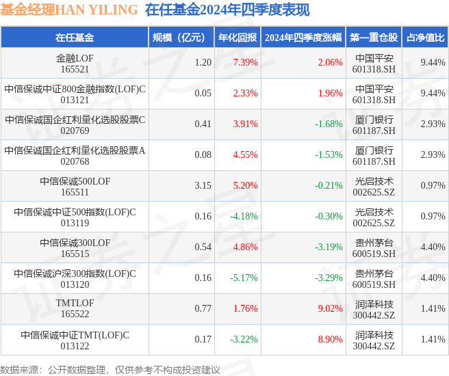 证券之星消息,日前中信保诚中证500指数(LOF)C基金公布四季报,2024年四季度最新规模0.16亿元,季度净值涨幅为-0.3%。