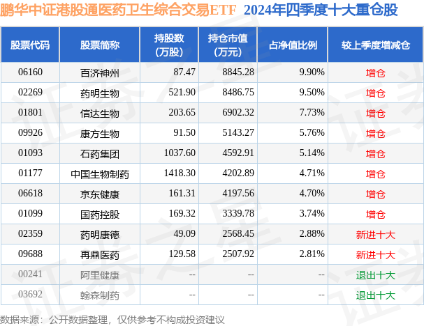 证券之星消息,日前鹏华中证港股通医药卫生综合交易ETF基金公布四季报,2024年四季度最新规模8.93亿元,季度净值涨幅为-12.98%。