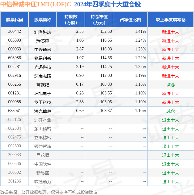 从基金规模来看,中信保诚中证TMT(LOF)C基金2024年四季度公布的基金规模为0.17亿元,较上一期规模1983.51万元变化了-317.35万元,环比变化了-16.0%。该基金最新一期资产配置为:股票占净值比94.11%,无债券类资产,现金占净值比6.39%。从基金持仓来看,该基金当季前十大股票仓位达11.97%,第一大重仓股为润泽科技(300442),持仓占比为1.41%。