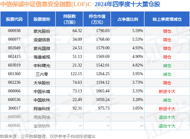 从基金规模来看,中信保诚中证信息安全指数(LOF)C基金2024年四季度公布的基金规模为0.89亿元,较上一期规模7111.55万元变化了1778.88万元,环比变化了25.01%。该基金最新一期资产配置为:股票占净值比94.02%,无债券类资产,现金占净值比6.62%。从基金持仓来看,该基金当季前十大股票仓位达43.11%,第一大重仓股为紫光股份(000938),持仓占比为5.59%。