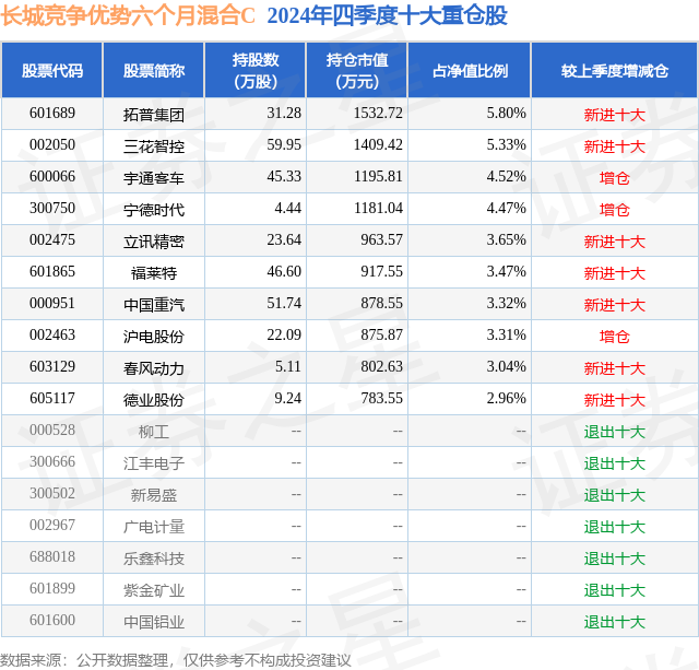 从基金规模来看,长城竞争优势六个月混合C基金2024年四季度公布的基金规模为0.31亿元,较上一期规模3378.84万元变化了-255.25万元,环比变化了-7.55%。该基金最新一期资产配置为:股票占净值比84.96%,无债券类资产,现金占净值比13.6%。从基金持仓来看,该基金当季前十大股票仓位达39.87%,第一大重仓股为拓普集团(601689),持仓占比为5.8%。