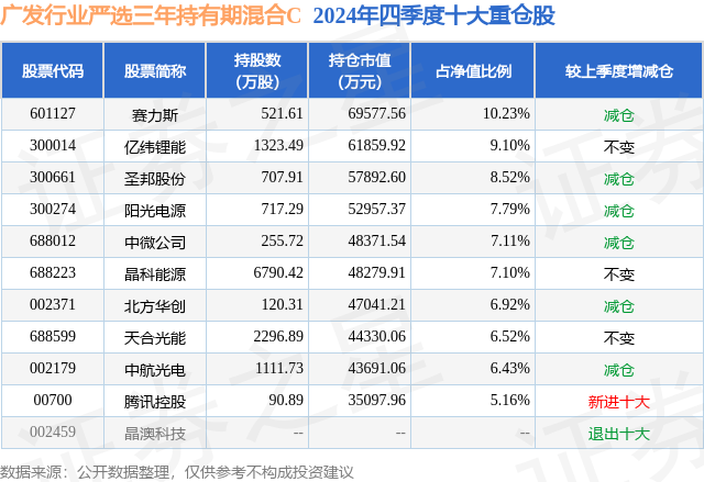 从基金规模来看,广发行业严选三年持有期混合C基金2024年四季度公布的基金规模为6.17亿元,较上一期规模6.94亿元变化了-7646.35万元,环比变化了-11.02%。该基金最新一期资产配置为:股票占净值比94.83%,债券占净值比1.89%,现金占净值比3.63%。从基金持仓来看,该基金当季前十大股票仓位达74.88%,第一大重仓股为赛力斯(601127),持仓占比为10.23%。