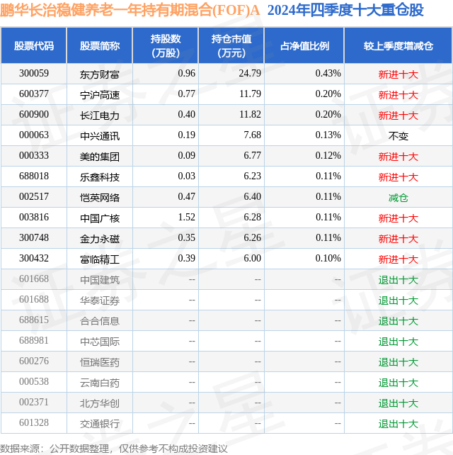 证券之星消息,日前鹏华长治稳健养老一年持有期混合(FOF)A基金公布四季报,2024年四季度最新规模0.54亿元,季度净值涨幅为0.6%。