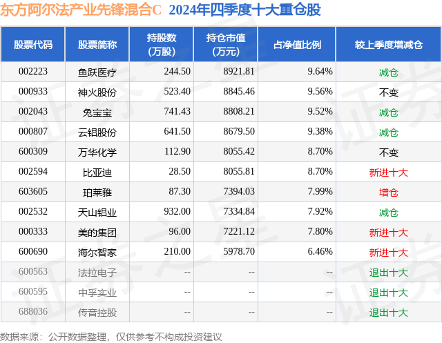 从基金规模来看,东方阿尔法产业先锋混合C基金2024年四季度公布的基金规模为2.24亿元,较上一期规模2.7亿元变化了-4594.58万元,环比变化了-17.04%。该基金最新一期资产配置为:股票占净值比92.32%,债券占净值比5.83%,现金占净值比2.15%。从基金持仓来看,该基金当季前十大股票仓位达85.67%,第一大重仓股为鱼跃医疗(002223),持仓占比为9.64%。