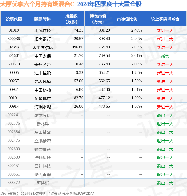 从基金规模来看,大摩优享六个月持有期混合C基金2024年四季度公布的基金规模为0.23亿元,较上一期规模2330.98万元变化了-36.87万元,环比变化了-1.58%。该基金最新一期资产配置为:股票占净值比93.19%,债券占净值比4.0%,现金占净值比9.29%。从基金持仓来看,该基金当季前十大股票仓位达17.88%,第一大重仓股为中远海控(01919),持仓占比为2.4%。