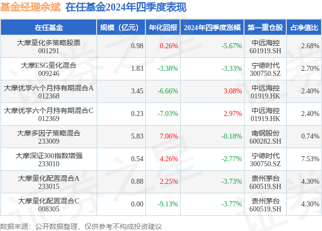 大摩优享六个月持有期混合C现任基金经理为余斌 缪东航,本季度增聘基金经理余斌、缪东航,近期离任的基金经理为何晓春、赵伟捷。其中在任基金经理余斌已从业10年又154天,2024年12月2日正式接手管理大摩优享六个月持有期混合C,任职期间累计回报为-1.06%。目前还管理着8只基金产品(包括A类和C类),其中本季度表现最佳的基金为大摩优享六个月持有期混合A(012368),季度净值涨幅为3.08%。