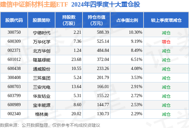 从基金规模来看,建信中证新材料主题ETF基金2024年四季度公布的基金规模为0.57亿元,较上一期规模6685.0万元变化了-972.46万元,环比变化了-14.55%。该基金最新一期资产配置为:股票占净值比97.35%,无债券类资产,现金占净值比2.93%。从基金持仓来看,该基金当季前十大股票仓位达52.55%,第一大重仓股为宁德时代(300750),持仓占比为10.3%。