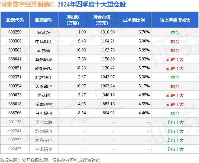 从基金规模来看,同泰数字经济股票C基金2024年四季度公布的基金规模为1.26亿元,较上一期规模1.03亿元变化了2306.58万元,环比变化了22.34%。该基金最新一期资产配置为:股票占净值比88.87%,无债券类资产,现金占净值比0.41%。从基金持仓来看,该基金当季前十大股票仓位达54.86%,第一大重仓股为寒武纪(688256),持仓占比为6.76%。