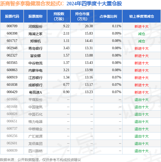从基金规模来看,浙商智多享稳健混合发起式C基金2024年四季度公布的基金规模为0.0亿元,较上一期规模2072.47万元变化了-2033.15万元,环比变化了-98.1%。该基金最新一期资产配置为:股票占净值比5.93%,债券占净值比86.81%,现金占净值比1.63%。从基金持仓来看,该基金当季前十大股票仓位达0.81%,第一大重仓股为河钢股份(000709),持仓占比为0.11%。